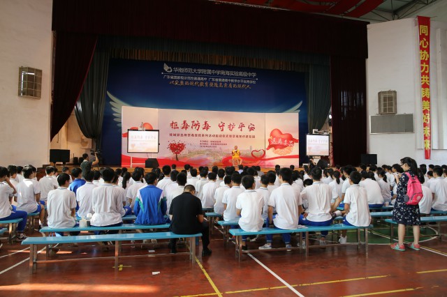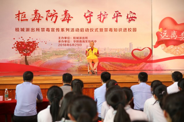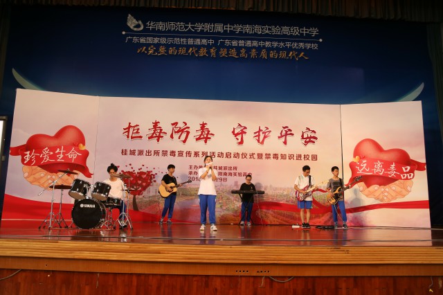 活动流程: 15:15—15:30 签到及学生观摩仿真毒品 15:30—15:35 开场舞蹈(学校提供) 15:35—15:40 主持人开场白 15:40—15:45 华附南海实验高中党委书记校长梁建伟发表题为“预防毒品教育功在当代,利在千秋”的禁毒宣言 15:45—15:50 桂城街道党工委委员、桂城派出所汤荣宝所长发表题为“拒毒防毒 守护平安”的禁毒宣言 15:50—15:55 领导共同启动禁毒宣传系列活动 15:55—16:20 观看禁毒警示短片 16:20—16:25 与学生提问互动一 16:25—16:30 文艺节目(华附韩流社作品---韩流舞蹈) 16:30—16:40 成功戒毒人员的现身说法 16:40—16:50 禁毒宣讲 16:20—16:25 与学生提问互动二 16:45—17:00 师生签名远离毒品 17:00 活动结束