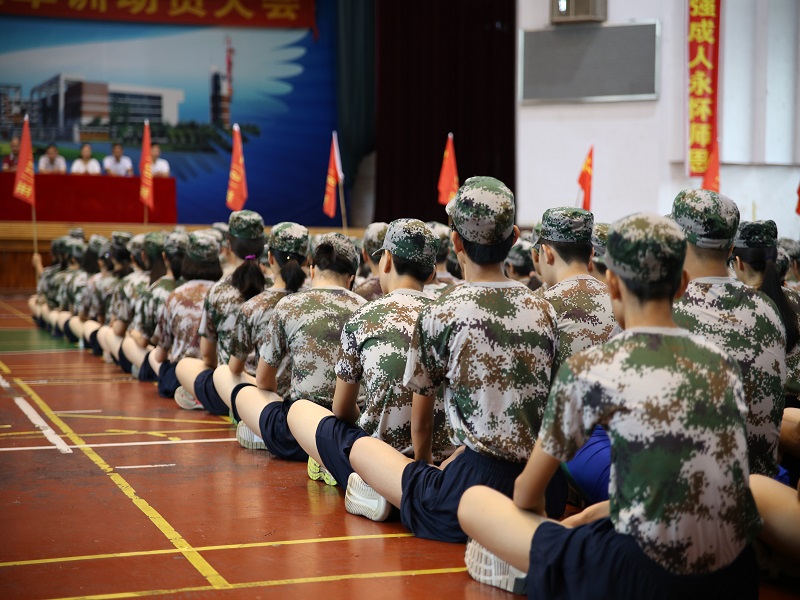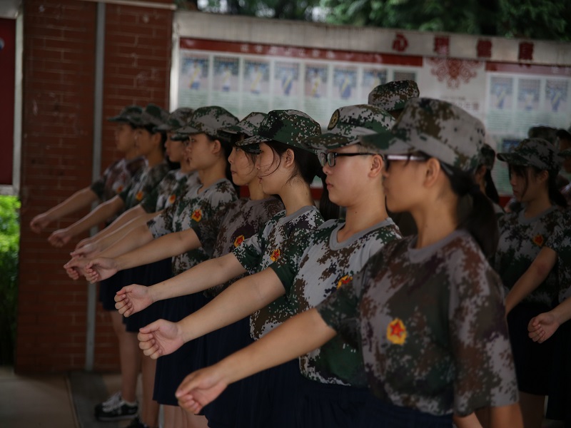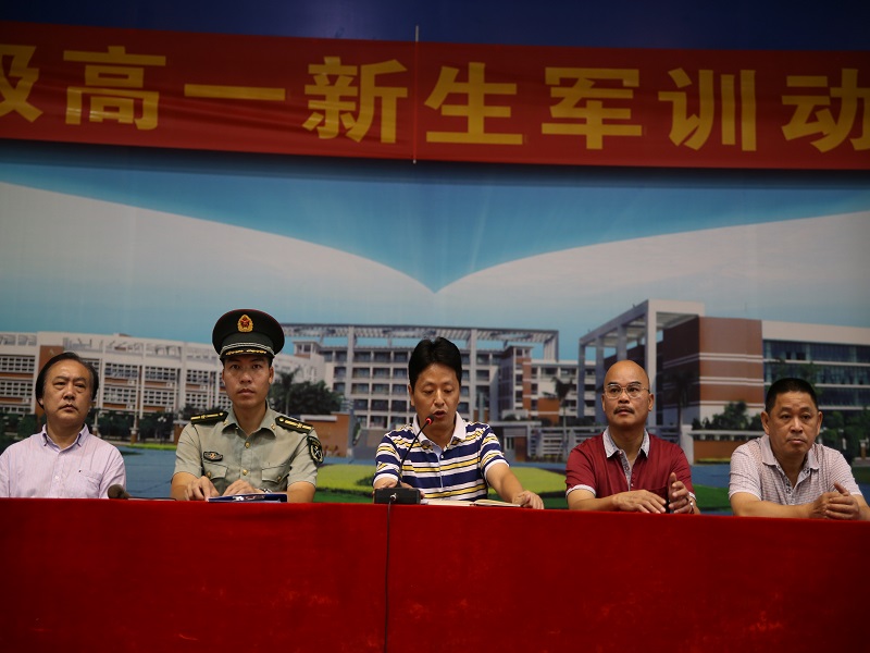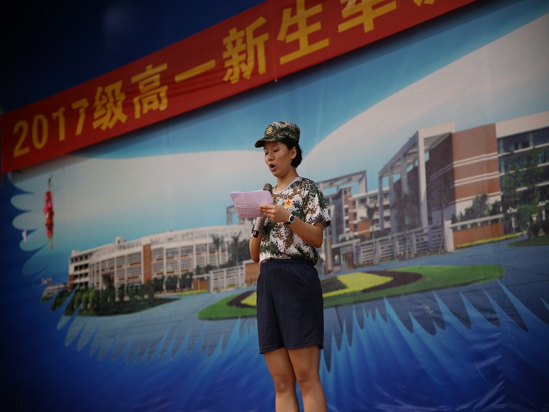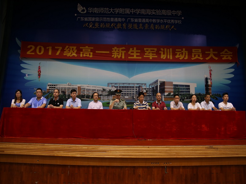 开营篇 华附南海实验高中2017级军训开营仪式于28日上午8点在体育馆隆重拉开帷幕,刘晔副校长、高一级全体行政、年级主任、班主任、教官和近900学生参加,会议由德育处主持。 27号台风“帕卡”肆虐广东,风雨交加,是我校高一新生报到的日子。学校灵活调整,允许部分高一新生因天气原因推迟一天报到,但是28日的早上近900名同学克服了各种困难,7点30分已经齐刷刷、井然有序地出现在体育馆,汇集成了一片绿的海洋。开营仪式上,当刘晔副校长、军训总队长、学生代表发言时,下面掌声雷动,节奏感和韵律感交汇,洋溢着无比地青春活力。
