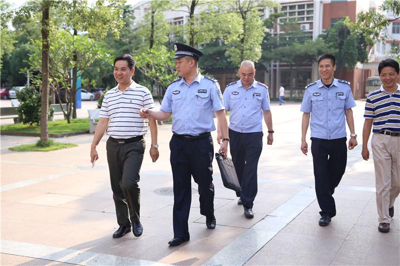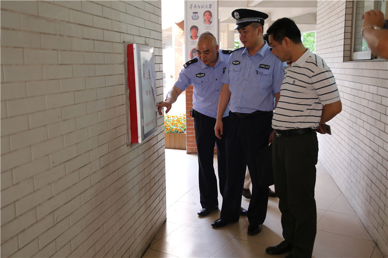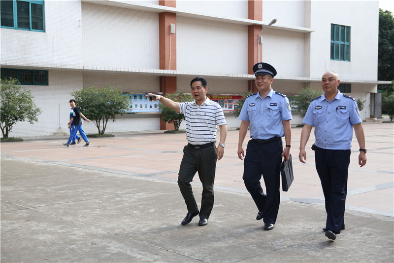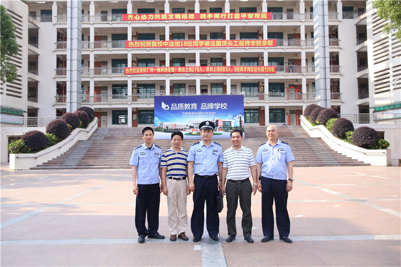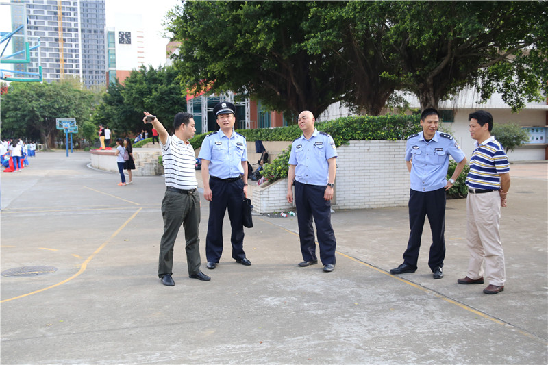 5月8日下午,华附南海实验高中法制校长桂城派出所副所长林振国到我校指导校园安全防范工作。在梁建伟校长、刘晔副校长的陪同下,林所长和社区治安大队李队长、梁队长、黎指导员等一行人实地认真察看了学校以及校园周边环境,检查学校消防设施设备,了解我校各种安全措施的落实情况。 针对检查情况,林所长对我校安全工作予以充分肯定,并在继续加强对学生的安全教育,增强师生安全意识,做好校园安全维稳工作,定期维护检查消防设施,及时消除安全隐患等方面提出了指导性的意见和建议。(图文:杨小慧)