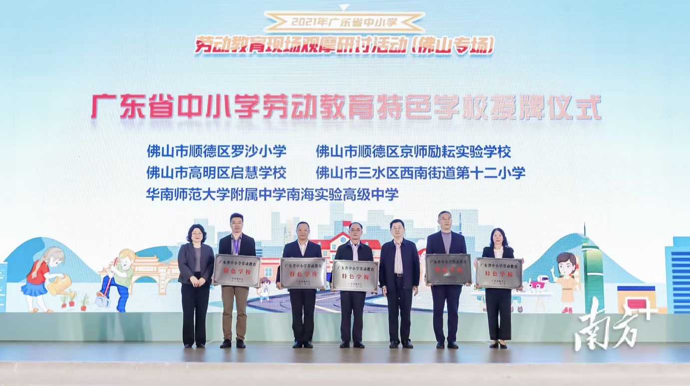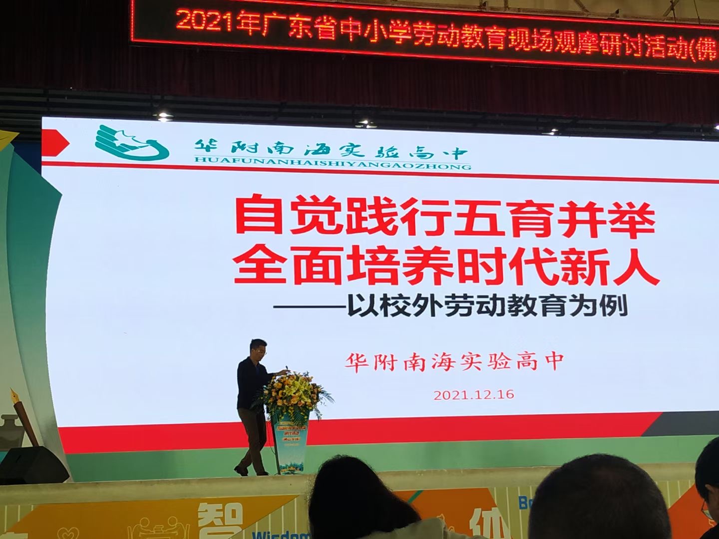 12月16日,2021年广东省中小学劳动教育第4场现场观摩研讨活动在佛山举行,华南师范大学附属中学南海实验高级中学(简称南海华附)荣获“广东省中小学劳动教育特色学校”称号,是佛山市唯一一所普通高中。副校长张兴前作现场经验分享。