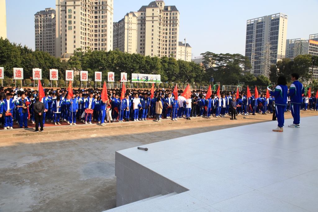 各班学生代表顺序走上主席台,舞动班旗、高举横幅,带领同学们齐声喊出班级口号。