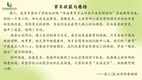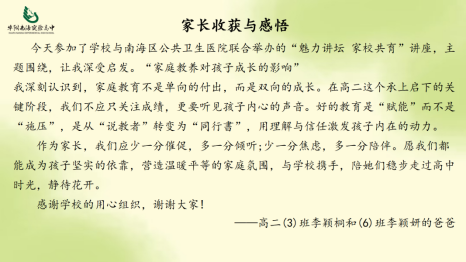 讲座结束后,多位家长分享了他们的收获与感悟。一句句真诚的话语,不仅是对讲座内容的认可,更是家校同心、携手共育的温暖见证。一起来看看他们的收获: