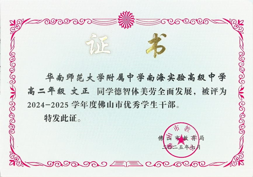 【事迹】作为学生干部,我始终怀揣着对成长的渴望与对集体的热爱,砥砺前行。在班级中担任班长,我积极营造良好班风,组织各类学习互助活动,带领班级在各项评比中屡获佳绩。学习上,我以 “千磨万击还坚劲” 的毅力,攻克一个又一个知识难关,成绩稳居年级前列,还在学科竞赛中斩获多项荣誉。生活中,我积极参与志愿服务,用行动传递温暖与力量。我相信,每一次努力都是成长的足迹,每一份付出都将化作进步的动力,我将继续在学习与工作的道路上,向着更高目标奋勇前行。